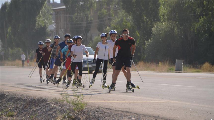رغم السيارات المارة والمخاطر.. يتدرب فريق تزلج بالعجلات في قضاء يوكسك أوفا بولاية هكاري جنوب شرقي تركيا، على طرق عامة، لعدم وجود مضمار خاص للتدريب في المنطقة.