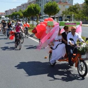 وقال أولماز، للأناضول، إنه وشريكة حياته “يعشقان ركوب الدراجات الهوائية، لذا قررا القيام بمثل هذه الخطوة يوم زفافهما، ولقيا دعمًا من أصدقائهما”.