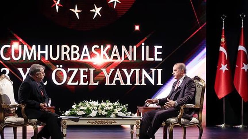 جاء ذلك في حوار تلفزيوني أجراه أردوغان، بالعاصمة أنقرة، بمناسبة مرور 3 أعوام على توليه منصب الرئاسة في البلاد.