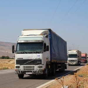 وتوجهت الشاحنات إلى سوريا، عبر معبر جيلوة غوزو، في ولاية هطاي جنوبي تركيا، المقابل لمعبر باب الهوى السوري.