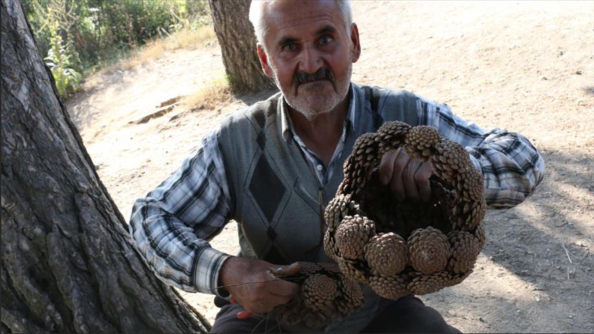 وقال أوزجان، إنه يقوم بصناعة سلات بأحجام مختلفة من أكواز الصنوبر والأسلاك، وكل سلة تستغرق صناعتها أكثر من ساعتين.