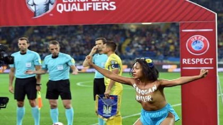 اقتحمت فتاة عارية الصدر من ناشطات منظمة” فيمين” النسائية ذائعة الصيت ملعب كرة القدم، قبل مباراة الجولة السابعة من تصفيات كأس العالم 2018 بين منتخبي أوكرانيا وتركيا.