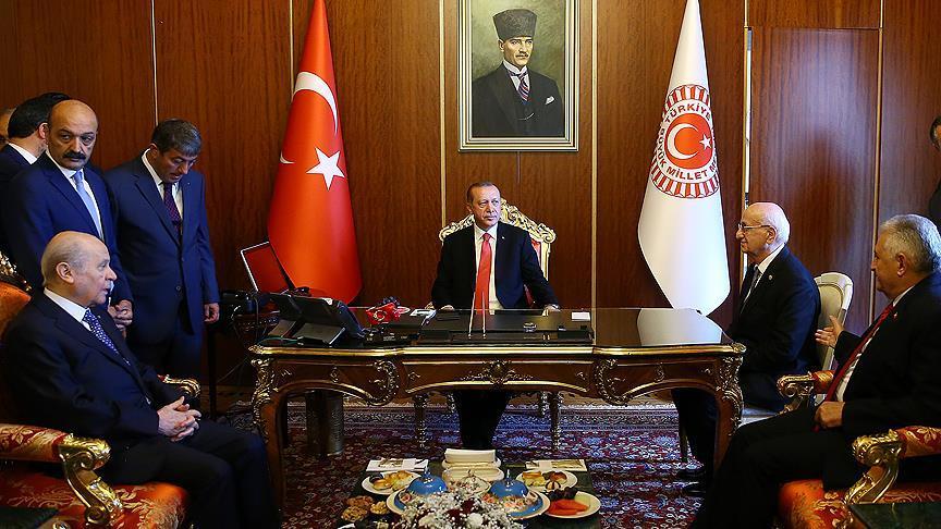 التقى الرئيس التركي رجب طيب أردوغان ورئيس الوزراء بن علي يلدريم، وزعيم حزب الحركة القومية دولت بهجه لي، برئيس البرلمان التركي إسماعيل قهرمان، اليوم الأحد.