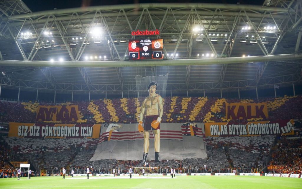 وفتح المشجعون قبل انطلاق المباراة بين غلطة سراي ومنافسه المحلي فناربهتشه، الأحد، لافتة كبيرة بالأحمر والأصفر وراء المرمى عليها شخصية “روكي” التي قام بأدائها الممثل الشهير سلفستر ستالون في أحد أفلامه مع تعليق يقول “انهض” و”إنهم يبدون كباراً لأنك راكع”.