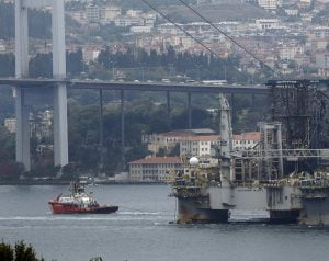 Transocean's GSF Development Driller II passes by the Bosphorus bridge on its way to the Black Sea, in Istanbul September 6, 2014. REUTERS/Murad Sezer (TURKEY - Tags: ENERGY BUSINESS)