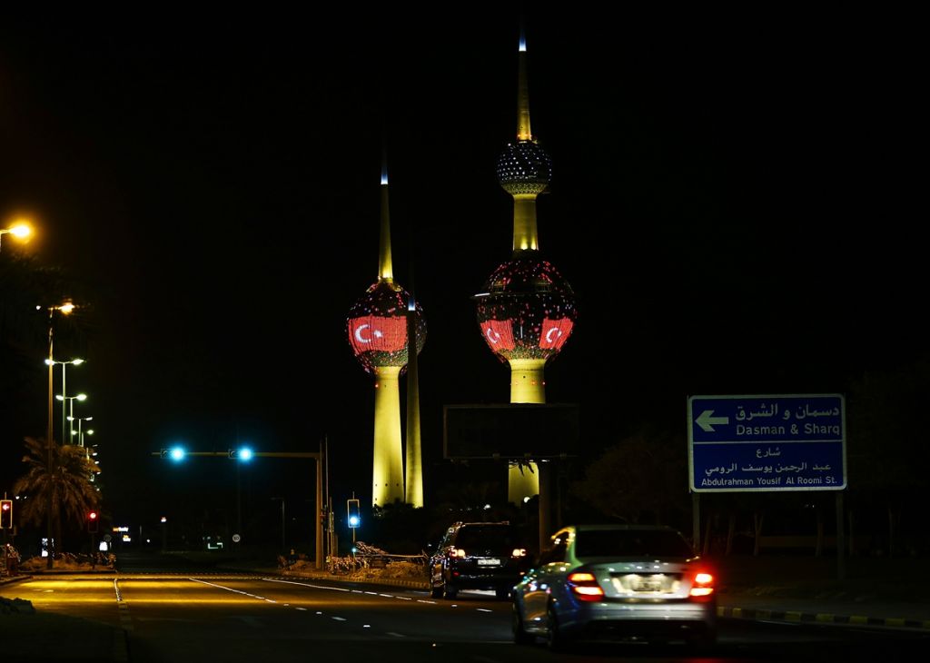 الأبراج الموجودة في ميدان “الخليج العربي” بالعاصمة الكويت، على ساحل البحر، تلونت، مساء الإثنين، باللونين الأحمر والأبيض، بسبب انعكاس العلم التركي عليها، بحسب مراسل الأناضول.