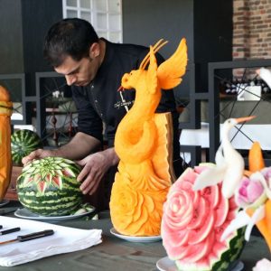 يحول أطلي الفجل إلى شكل البجعة، واليقطين إلى تنين، والبطيخ لوردة حمراء.
