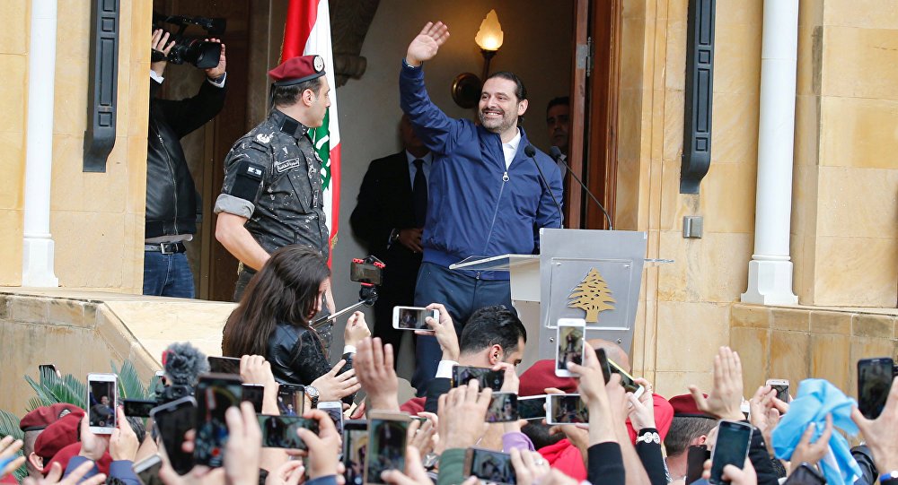 وظهر الحريري أثناء خروجه من قصر الوسط في بيروت، ليلقي كلمته أمام مؤيديه، الذين رفعوا أعلام لبنان وأعلام تيار المستقبل، ابتهاجا بعودة رئيس الوزراء من المملكة العربية السعودية.