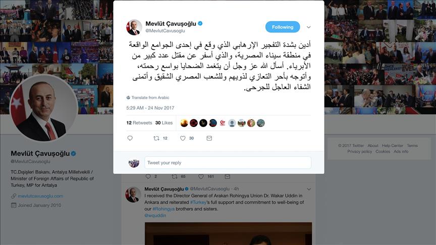وقال جاويش أوغلو في تغريدة على تويتر: “أدين بشدة التفجير الإرهابي الذي وقع في مسجد بمنطقة سيناء في مصر، وأودى بحياة العديد من الأبرياء”.