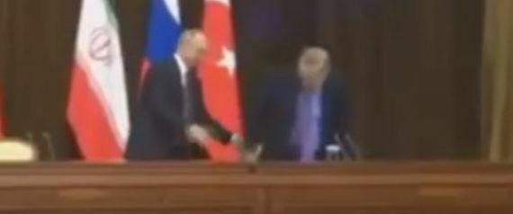 حاول الرئيس الروسي لعب دور “المضيف اللطيف” مع الرئيس التركي رجب طيب أردوغان في قمة سوتشي، فبادر فلاديمير بوتين إلى أن يبعد لأردوغان الكرسي الذي كان يجلس عليه بعد وقوفه، بحسب ما أظهرت لقطات من فيديو انتشر على مواقع الإنترنت. إلا أن المشهد تحوّل لموقف محرج بعدما سقط الكرسي على الأرض خلف الرئيس التركي.