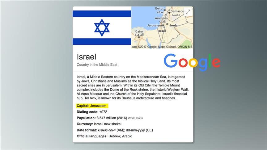 وحاولت الأناضول البحث عن عاصمة إسرائيل بمحرك البحث “غوغل” و”غوغل خرائط” وجاءت النتيجة “القدس”.