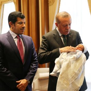 وقال العذبة إن الرئيس أردوغان “استقبل المولود تميم الذي رأى النور في الشقيقة تركيا، بالقصر الرئاسي مع والده سالم بن مبارك آل شافي، سفير دولة قطر في تركيا، وأذّن في أذنه اليمنى”.