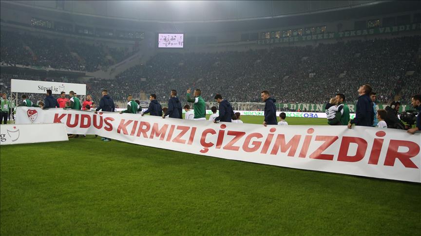 ودخل لاعبو الفرق التركية الملاعب قبل انطلاق مبارياتهم اليوم السبت وأمس الجمعة رافعين لافتات كتب عليها “القدس خط أحمر”.