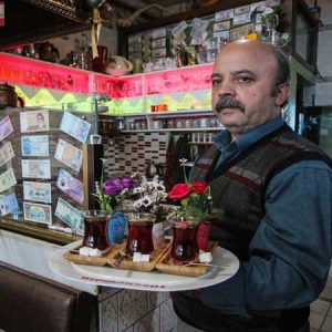 بطريقة فريدة من نوعها، يستقبل “فريدون تركمان” زبائنه الجدد في مقهاه بولاية بورصا شمال غربي تركيا؛ الأمر الذي لم يسلم منه حتى بعض المسؤولين المحليين والسياسيين.