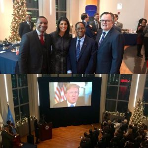 أقامت سفيرة الولايات المتحدة في الأمم المتحدة، نيكي هايلي، الأربعاء 3 يناير/كانون الثاني 2018، حفل استقبال لممثلي الدول التي دعمت واشنطن خلال التصويت الذي جرى في الجمعية العامة للأمم المتحدة، في ديسمبر/كانون الأول 2017، على قرار يدين اعتراف الرئيس دونالد ترامب بالقدس عاصمة لإسرائيل.