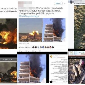 ويظهر في إحدى الصور المنشورة على موقع “تويتر”، بناء سكني يتعرض للحريق، وتدعي أن الجيش التركي يقصف المدنيين في عفرين، لكن الصورة في الحقيقة تم التقاطها بتاريخ 26 أبريل/نيسان 2016، من حريق لبناء سكني في مدينة السالمية الكويتية.