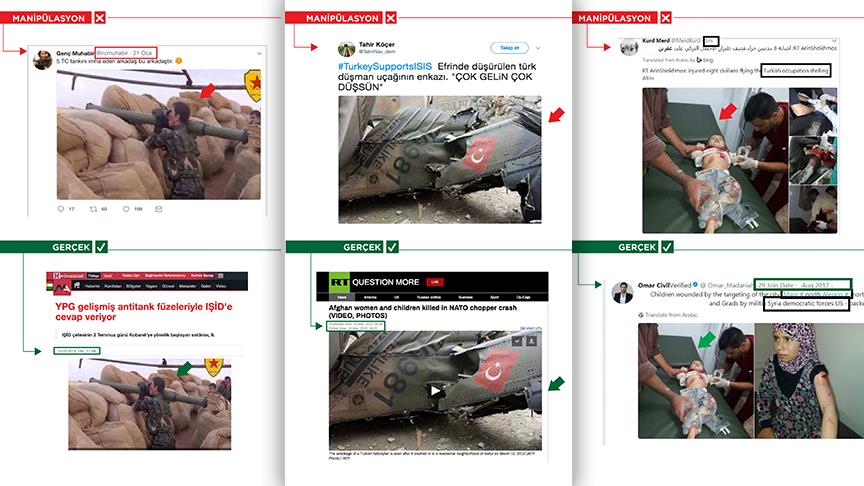 يستمر “بي كا كا” الإرهابي وأعوانه عبر مواقع التواصل الاجتماعية، حملته الهادفة لتشويه صورة عملية غصن الزيتون التي أطلقتها القوات التركية في منطقة عفرين بريف محافظة حلب السورية، وذلك عبر نشر صور ملفقة.