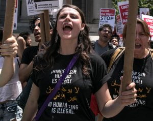 NEW YORK JUNE 10: Muslims supporters confront Trump supporters during an anti-sharia law rally organized by ACT for America on June 10, 2017 at Foley square in New York. (Photo by Maite H. Mateo/VIEWpress/Corbis via Getty Images)