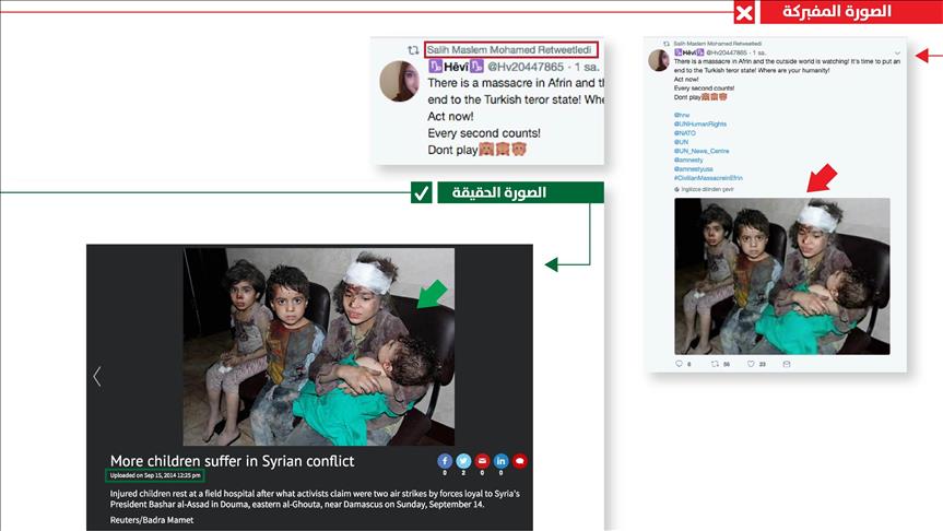 ويأتي نشر الصور الملفقة في محاولة لتشويه عملية غصن الزيتون التي أطلقتها تركيا والجيش السوري الحر ضد الإرهابيين في عفرين شمال غربي سوريا.