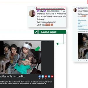 نشر “صالح مسلم” أحد قيادات تنظيم “ب ي د/ بي كا كا” الإرهابي في حسابه على موقع التواصل الاجتماعي “توتير” صورا لأطفال مصابين بالغوطة الشرقية التي يقصفها نظام الأسد باستمرار، زاعما بأنها في عفرين.