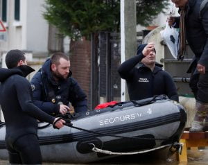 Paris police divers use a small boat to help a resident to leave home as they patrol a flooded street of a residential area in Villeneuve-Saint-Georges, near Paris, France January 25, 2018. REUTERS/Christian Hartmann TPX IMAGES OF THE DAY