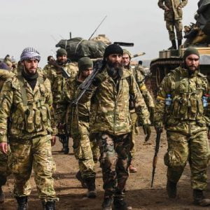 TOPSHOT - Syrian opposition fighters walk through Syria in front of Turkish troops near the Syria border at Hassa, Hatay province on January 22, 2018. Turkey on January 22, 2018 shelled Kurdish militia targets in Syria and claimed progress in a cross-border offensive that has stoked concern among its allies and neighbours. The Turkish military on January 20 launched operation "Olive Branch", its second major incursion into Syrian territory during the seven-year civil war. / AFP PHOTO / BULENT KILIC