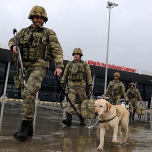 جرت، اليوم الخميس، في مطار بينغول جنوب شرقي تركيا، مراسم إرسال 200 جندي من القوات الخاصة، برفقتهم الكلبة “آي أفي”، المدرّبة على كشف الألغام، من أجل المشاركة في عملية “غصن الزيتون” التي تنفذها القوات المسلحة التركية شمالي سوريا ضد التنظيمات الإرهابية.