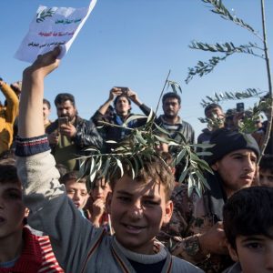وحاملين بأيديهم أغصان زيتون وعلم الثورة السورية، ردد المتظاهرون هتافات من قبيل “حربنا ليست ضد الأكراد، وإنما ضد عصابات بي كا كا /ب ي د الإرهابية”، و”نبارك من قلوبنا للجيش السوري الحر والقوات التركية تحرير جبل برصايا”.