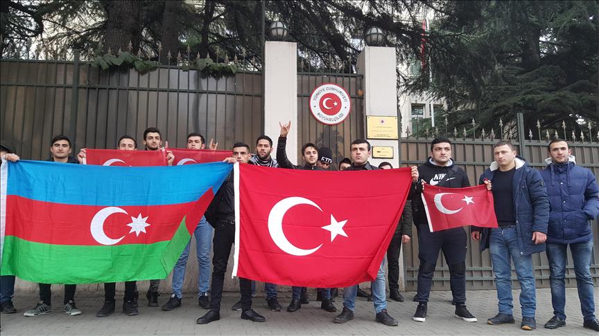 نظم مجموعة من المواطنين الجورجيين من أصول تركية أذربيجانية، اليوم الإثنين، وقفة أمام مبنى السفارة التركية في العاصمة الجورجية تبليسي، دعمًا لعملية “غصن الزيتون”.