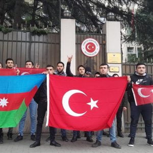 ورفع المشاركون في الوقفة أعلام تركيا وأذربيجان، حسب مراسل الأناضول.