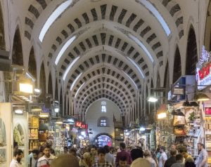 Horizontal picture of the Spice Bazaar, showing multiple archesand many shops on both sides