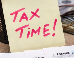 tax form with calculator, money and pen