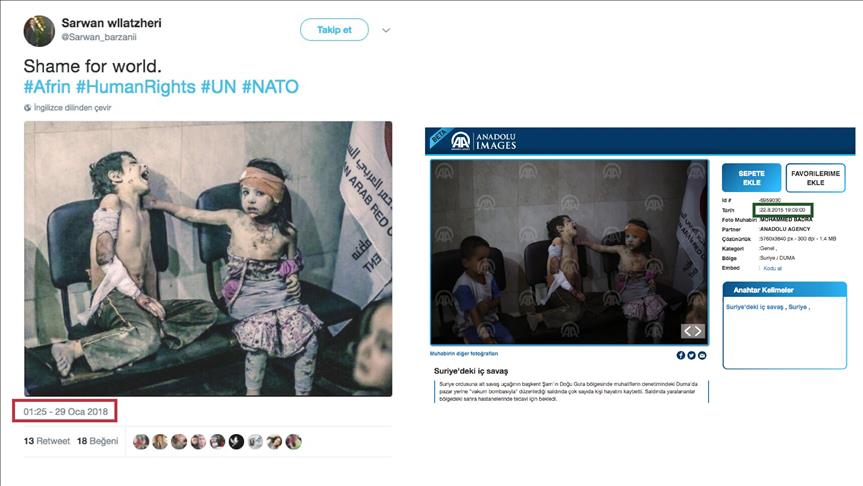 يواصل أنصار تنظيم “ب ي د/ بي كا كا” الإرهابي، نشر صور من وقائع وتواريخ مختلفة والإيهام بأنها حدثت في منطقة عفرين السورية خلال عملية “غصن الزيتون” التي ينفذها الجيش التركي ضد الإرهابيين.