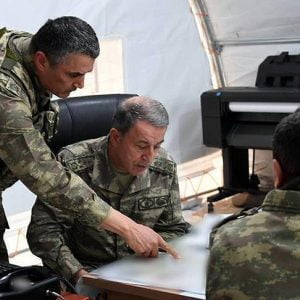 وذكرت رئاسة الأركان التركية، في بيان، الجمعة، أن “قادة القوات، رافقوا أكار خلال جولته التفقدية بطائرة عسكرية”.