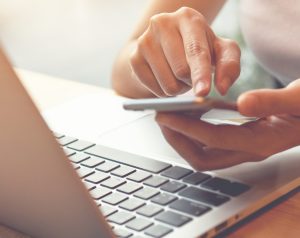 Cropped shot of a young Female using smart phone and notebook laptop computer, She working at coffee cafe, Woman at his workplace using technology, Morning flare light.