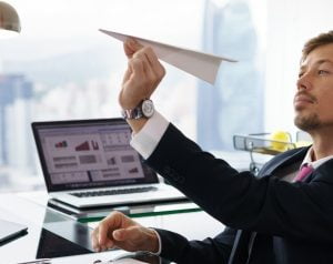 Corporate manager in modern office takes a break and prepares a paper airplane. The bored man dreams of his next vacations and leans back on his chair