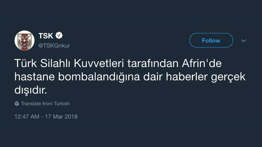 وقالت القوات المسلحة التركية، في تغريدة عبر حسابها على موقع التواصل الاجتماعي “تويتر”، فجر اليوم السبت، “إن الأنباء التي وردت حول استهداف قواتنا لمستشفى في عفرين، عارية عن الصحة”.