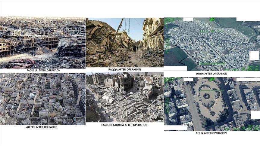 كما أرفقت القوات المسلحة التركية التغريدة، بصور لمدينتي حلب والرقة ومنطقة الغوطة الشرقية في سوريا، ومدينة الموصل العراقية، التي تم تدميرها إما من قبل النظام السوري أو التنظيمات الإرهابية أو قوات التحالف الدولي؛ مقابل صور لمدينة عفرين التي حررت، الأحد، من الإرهابيين، دون المساس بسلامتها.
