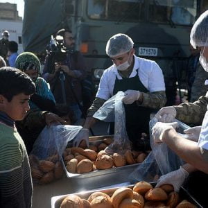 ويتم توزيع الخبز على المدنيين مجانًا، وتحت إشراف القوات المسلحة التركية، وذلك عبر الفرن المتنقل الموجود أمام مقر ناحية عفرين وسط المدينة.