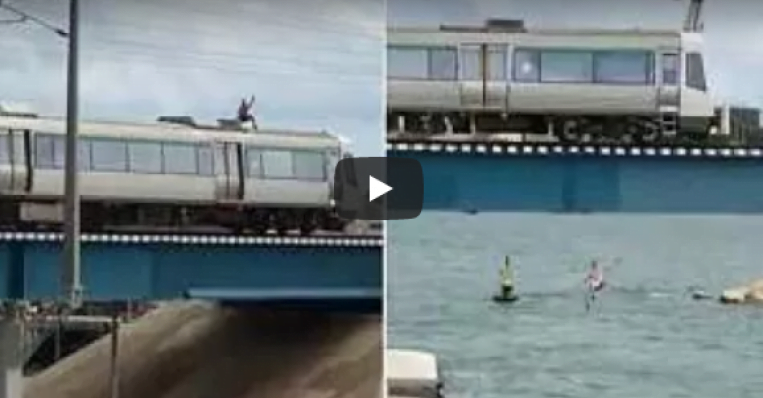 تداولت العديد من منصات التواصل الاجتماعي تسجيلاً مصوراً يظهر أحد الشبان وهو يخاطر بحياته عبر القفز من فوق قطار مسرع باتجاه المياه.