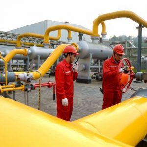 Workers inspect equipment at a shale gas field of Sinopec in Fuling, Chongqing, China November 2, 2017. Picture taken November 2, 2017. REUTERS/Stringer ATTENTION EDITORS - THIS IMAGE WAS PROVIDED BY A THIRD PARTY. CHINA OUT.