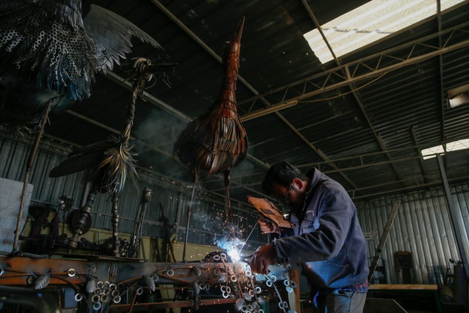 بلمسات فنية يقوم الحداد التركي “إلهامي أجار” بصنع تماثيل غاية في الجمال باستخدام خردة السيارات القديمة، في ورشته بولاية إزمير غربي تركيا.