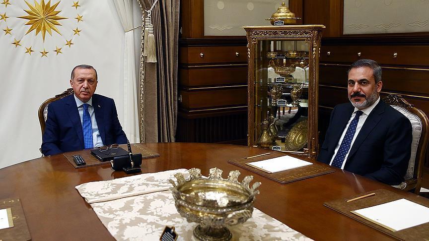استقبل الرئيس التركي رجب طيب أردوغان، اليوم الجمعة، رئيس جهاز الاستخبارات الوطنية التركية هاكان فيدان.