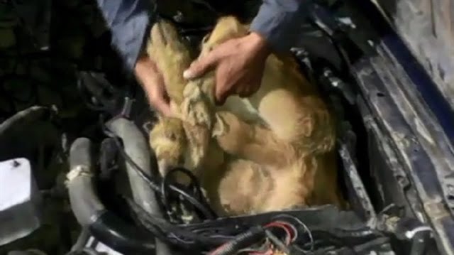 واشار البيان الى ان الغطاء البلاستيكي الموضوع على اسطوانة محرك السيارة كان يتحرك اثناء عملية الفحص. وتبين بعد فتح الغطاء وجود عجلين مربوطتين اقدامهما في مقصورة خاصة داخل المحرك.