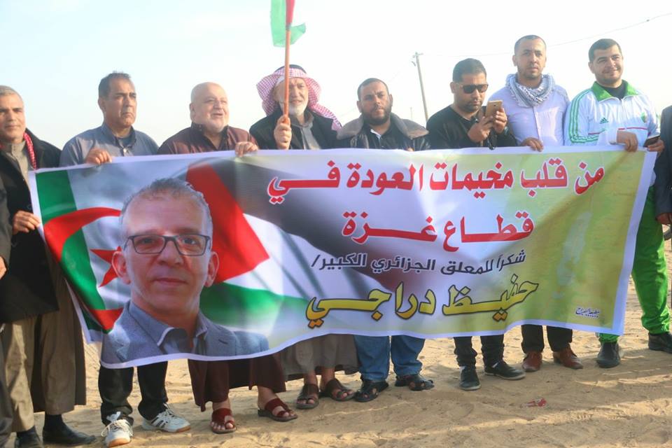 ورفع الفلسطينيون صور المذيع الجزائري وأعلام الجزائر خلال مسيرات العودة الكبرى على حدود قطاع غزة أمس الجمعة، وبينهم رئيس المكتب السياسي لحركة حماس إسماعيل هنية، الذي أشاد بجهود دراجي ورفع صورته.