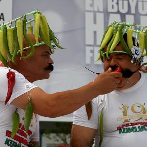 وقبيل انطلاق المسابقة، على هامش المهرجان الـ19 للزراعة والبيوت البلاستيكية، في قضاء كومولوجا، جرى توزيع طماطم وعبوات عيران (مشروب شعبي في تركيا يعد من اللبن) على المتسابقين؛ لتخفيف المذاق الحار للفلفل.