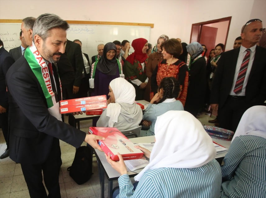 وتم التوزيع خلال حفل أُقيم في مدرسة البيرة التركية، بحضور نائب رئيس البرلمان التركي، أحمد أيدن، ورئيس مجموعة الصداقة البرلمانية التركية حسن توران، والسفير التركي في فلسطين غورجان تورك أوغلو، ووكيل وزارة التربية والتعليم الفلسطيني بصري صالح، ووفد طلابي من مدرسة “تنزيلة أردوغان” (مدرسة تركية).