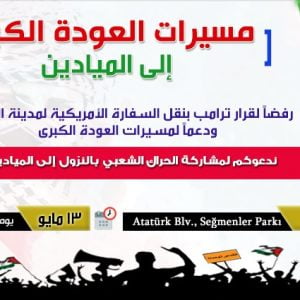 رفضاً للاحتلال الإسرائيلي ودعماً لحق العودة الفلسطيني؛ دعا “حراك شبابي فلسطيني” بالتعاون مع جمعية الـİHH للمشاركة الواسعة في الوقفة الاحتجاجية يوم الأحد الموافق 13/05/2018م في تمام الساعة 12:00 ظهراً، وذلك في بارك سيغمنلار الواقع في شارع أتاتورك بالعاصمة أنقرة.