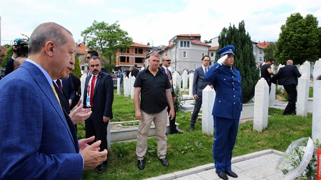 ورافق أردوغان في زيارة المقبرة عقيلته أمينة، ورئيس المجلس الرئاسي في البوسنة والهرسك، بكر عزت بيغوفيتش.
