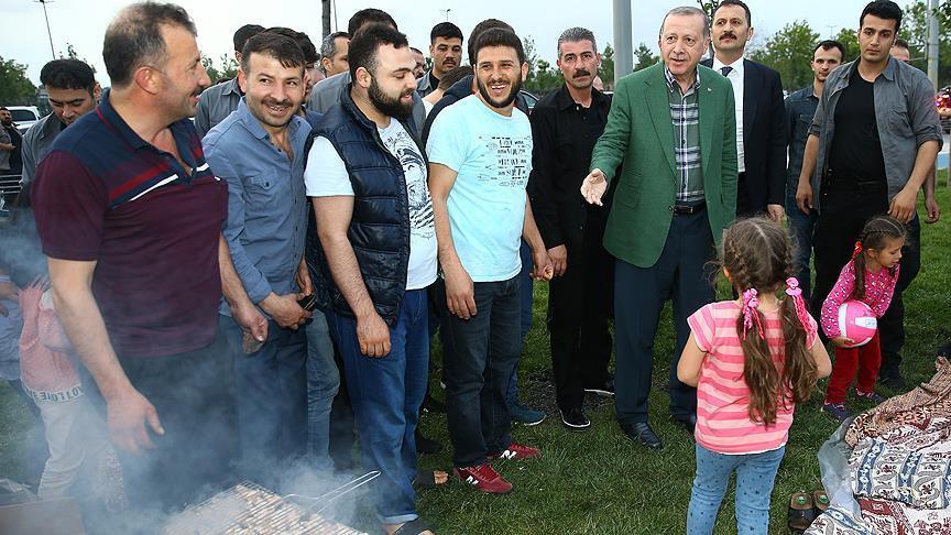 تجاذب الرئيس، رجب طيب أردوغان، أطراف الحديث مع مجموعة من المواطنين، كانوا يستعدون للإفطار في إحدى حدائق إسطنبول، اليوم السبت.